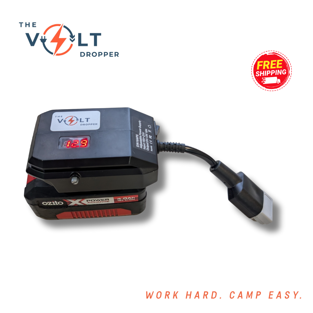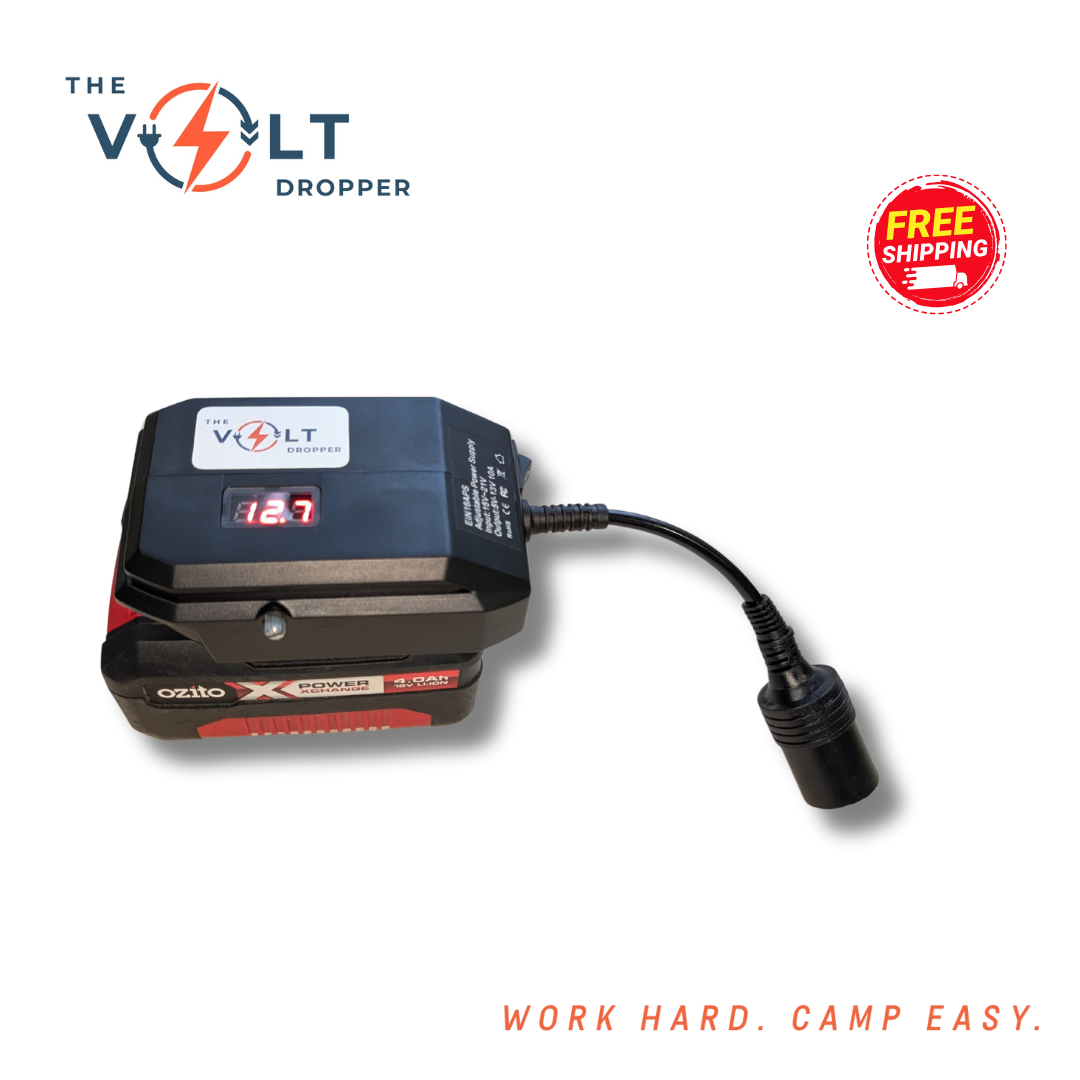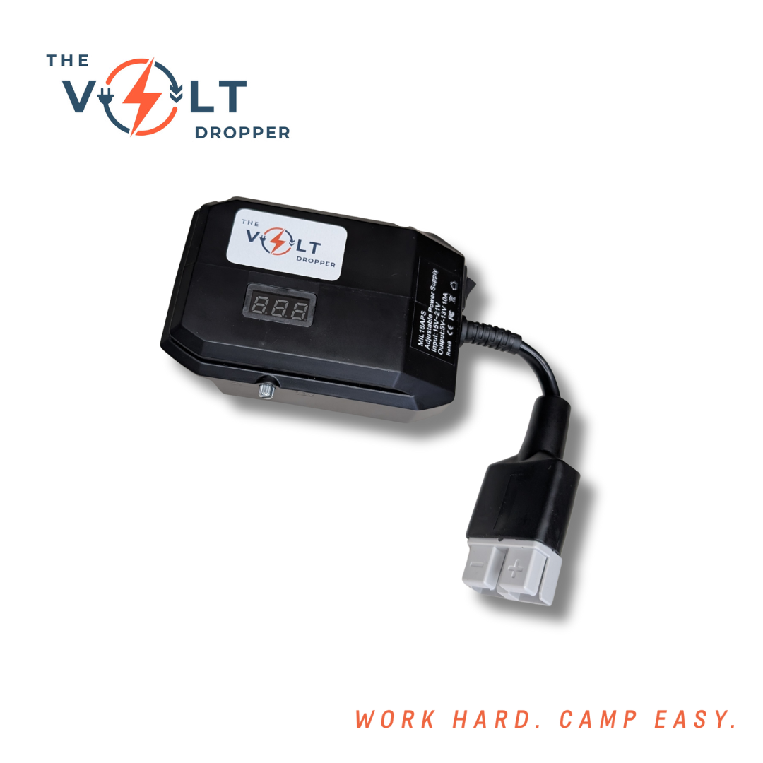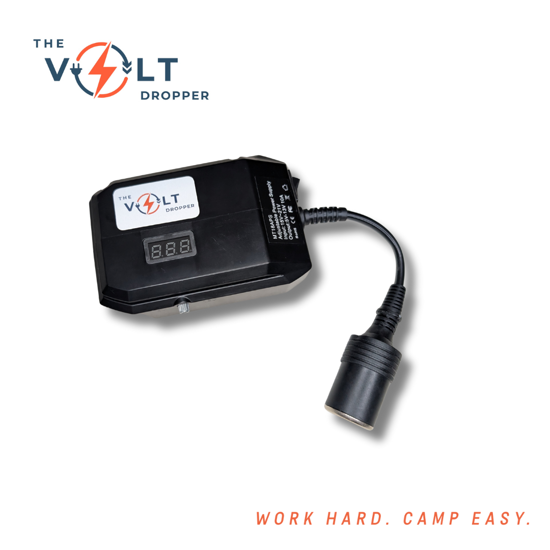 No more warm drinks or dead lights when you're off the grid. The Volt Dropper lets you run 12V gear — like your car fridge, LED lights, air pump or camp fans — directly from your 18V tool battery. No hardwiring. No vehicle idling. Just plug in and power up.