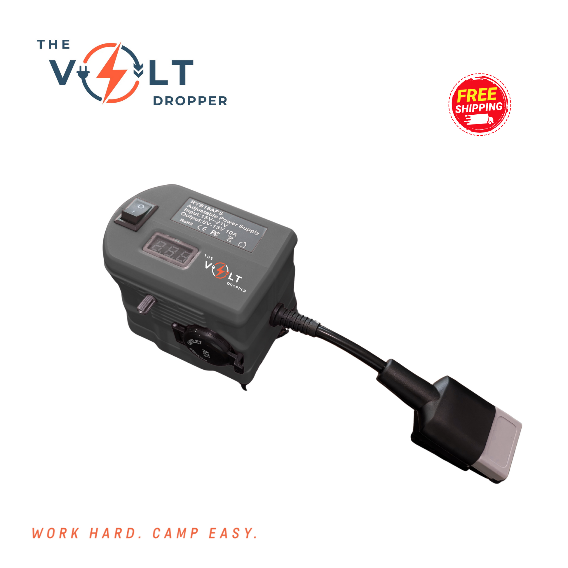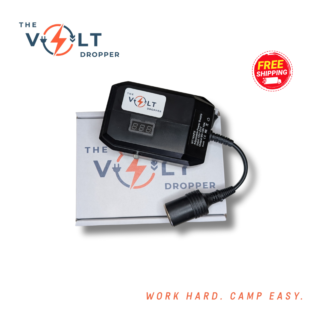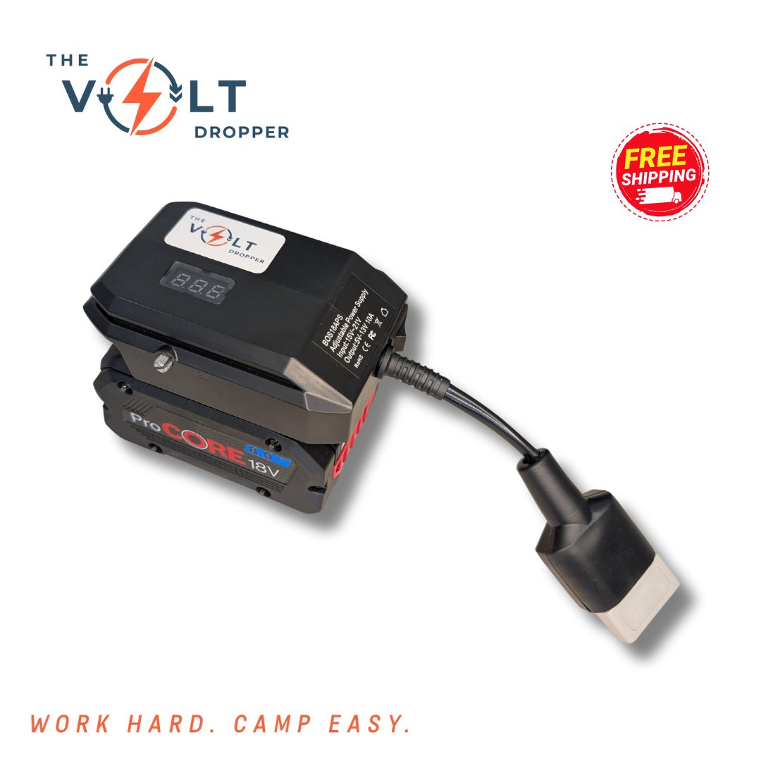 No more warm drinks or dead lights when you're off the grid. The Volt Dropper lets you run 12V gear — like your car fridge, LED lights, air pump or camp fans — directly from your 18V tool battery. No hardwiring. No vehicle idling. Just plug in and power up.